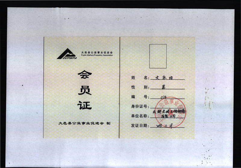 大邑縣公益事業(yè)促進(jìn)會(huì)會(huì)員證